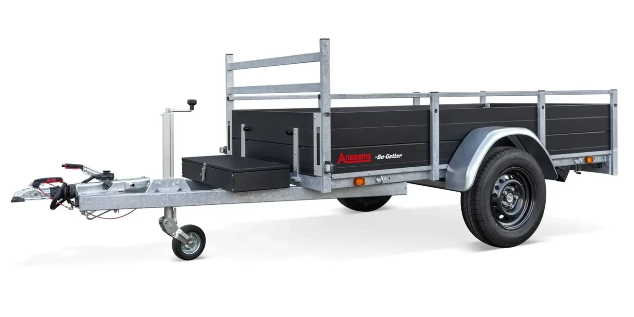 Remorque neuve livrée montée sous 4 semaines maximum en France continentale (hors Corse et îles). Vendu avec ou sans bâche et armatures. Remorque basculante avec un double essieu PTAC : 500 kg. AL-KO force 750 kg (1500 kg). Bâche haute de 80 cm et armature incluses. Taille de pneus standard : 155/70 R13.