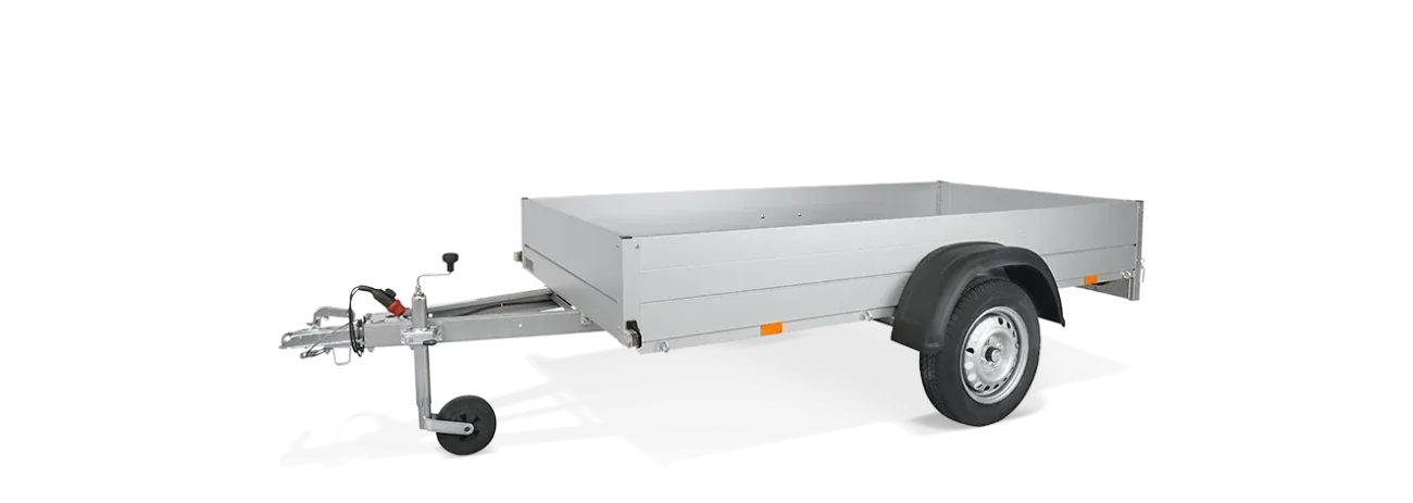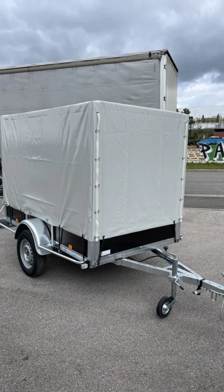 Remorque simple essieu. Disponible seule, avec une bâche et son armature ou en version basculante. Grande remorque avec ridelle arrière amovible et basculante. L'essieu peut supporter jusqu'à 750 kg. Remorque neuve livrée montée sous 4 semaines maximum en France continentale (hors Corse et îles). Taille de pneu standard : 155/70 R13. PTAC : 499 kg, possibilité d'avoir un PTAC de 750 kg. Garantie 12 mois.