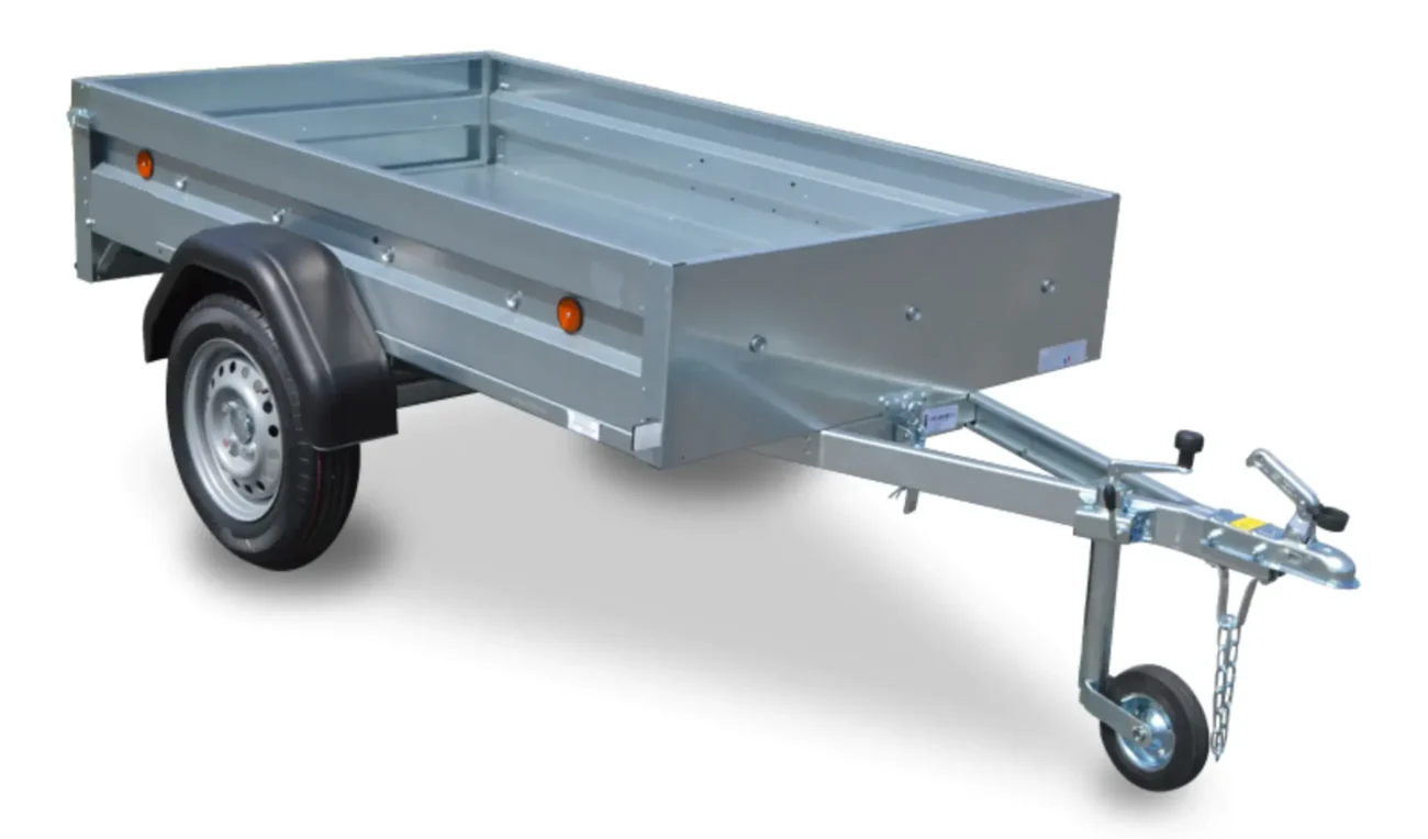 Remorque neuve livrée montée sous 4 semaines maximum en France continentale (hors Corse et îles). Vendu avec ou sans bâche et armatures. Remorque basculante avec un double essieu PTAC : 500 kg. AL-KO force 750 kg (1500 kg). Bâche haute de 80 cm et armature incluses. Taille de pneus standard : 155/70 R13.